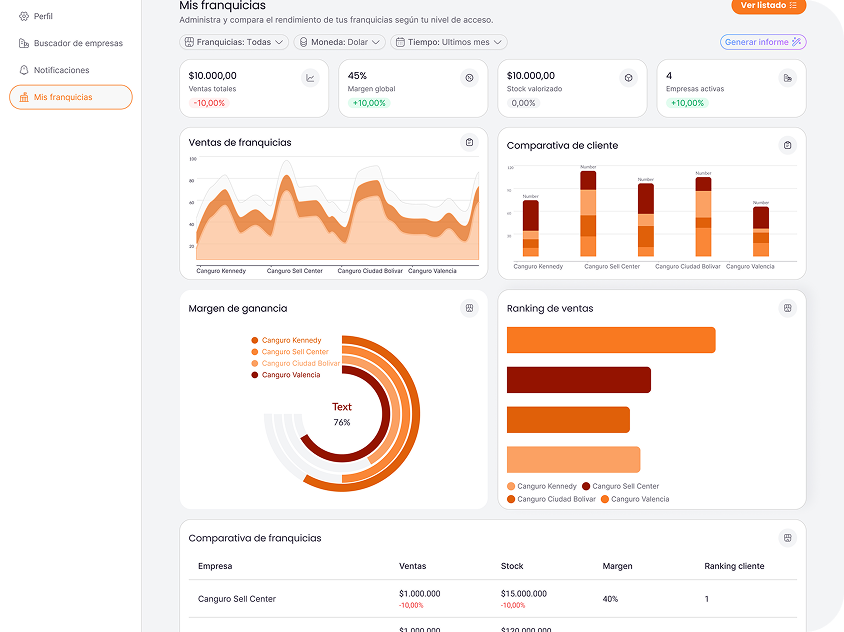 Accede a comparativos en tiempo real por tienda, región o categoría. Transforma los datos dispersos en un tablero de mando unificado para entender quién lidera el crecimiento y dónde están las oportunidades de optimización.